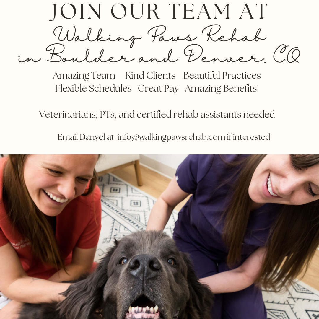 Walking Paws Rehab in Boulder, CO (and now in Denver!) is looking to hire some additional full-time or part-time therapists as our clinic is expanding.